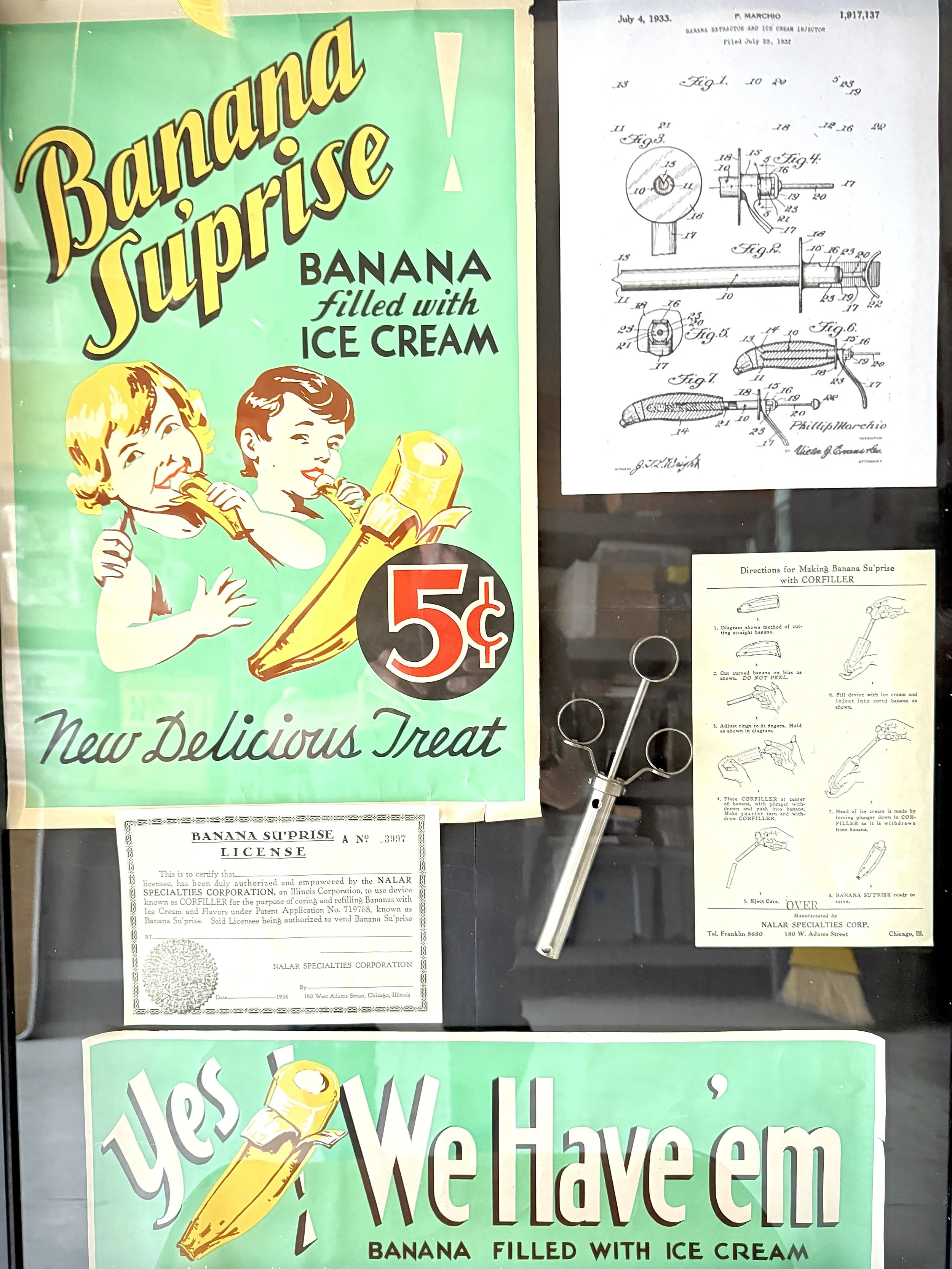 On July 4, 1933, inventor P. Marchio was awarded a patent numbered 1,917,137 for a banana extractor and ice cream injector apparatus. The intended purpose was to create a new ice cream serving that amounted to an ice cream-packed banana.